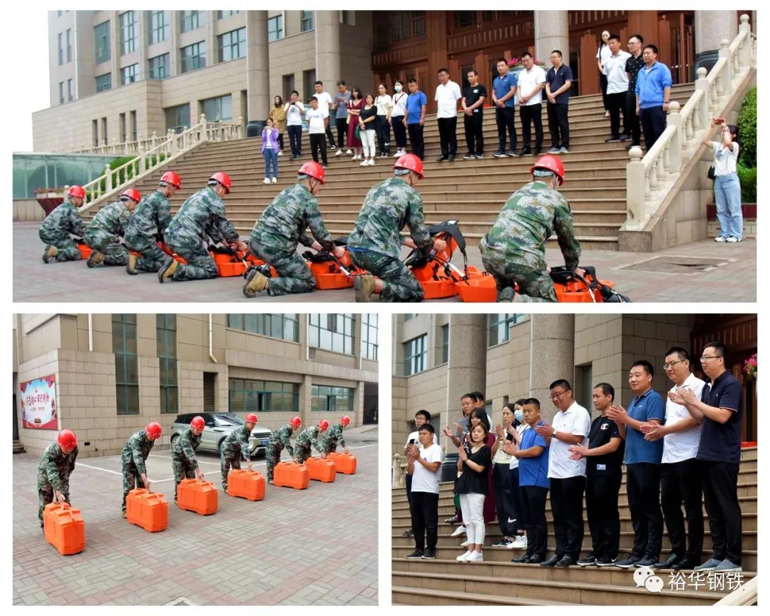 在集團辦公樓門前,考察團一行饒有興致地觀看了裕華團委組織的民兵應急救援演練節目。隨著教官一聲聲高亢激昂的口令聲,身著迷彩服的民兵一個個精神抖擻,邁著整齊的步伐進行隊列訓練,雖然天氣炎熱,但民兵隊伍個個精神抖擻,身手敏捷,救援動作干脆利落,贏得大家的交口稱贊。