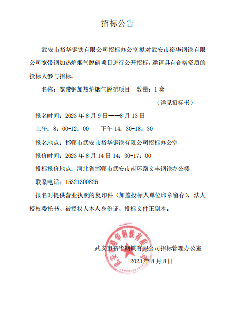 寬帶鋼加熱爐煙氣脫硝項目 招標公告